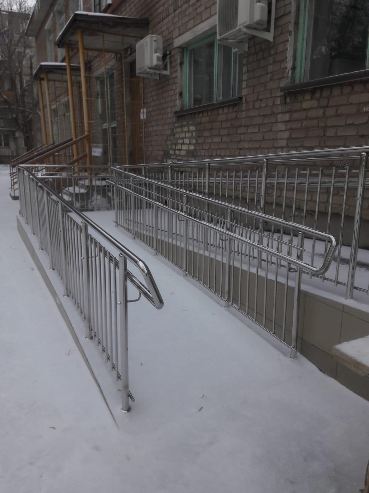 Декоративное ограждение.Пандус - Лицей ( для дошкольных и учебных учреждений)Стойки 38 мм. Двойной поручень 38 мм. ригель 16 мм через 100 мм ( снип ) Высота 900 мм Марка стали aisi 304
